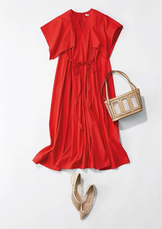 綿ストレッチのサッカー素材は、肌あたりがよく着心地抜群。小物はヌーディーカラーでワンピを主役に。さらりとまとう赤に、大人の愛らしさを薫らせて。
