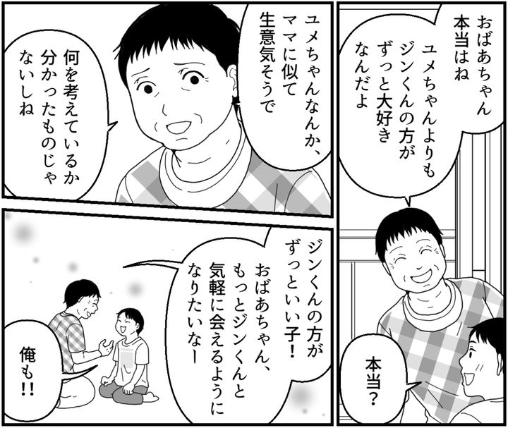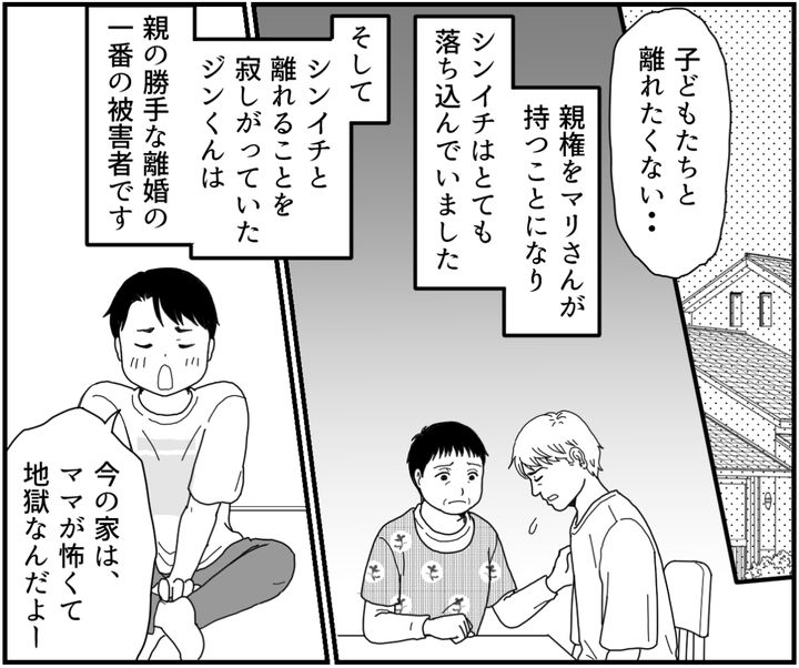 私(元義母)は現在ひとり暮らしをしています。息子のシンイチはかつてマリさんという女性と結婚して、娘のユメちゃんと息子のジンくんに恵まれました。けれどマリさんとの結婚生活はとても窮屈なものだったらしく……。疲れたシンイチは、つい魔がさして不倫に走りました。すると自己主張の強いマリさんに、シンイチは離婚を言い渡されてしまったのです。子どもたちを溺愛していた可哀想なシンイチは、親権を取られてとても落ち込んでいました。