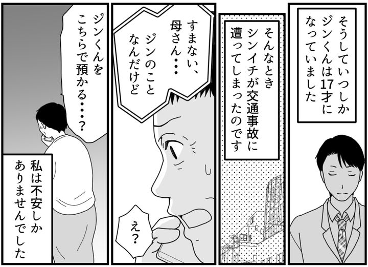 現在ジンくんは17才です。そんなときシンイチが交通事故に遭うという災難が降りかかってきました。幸い命に別状はありませんでしたが、退院して普通に日常生活を送れるようになるまでは数ヶ月かかるとお医者さんに言われてしまいました。