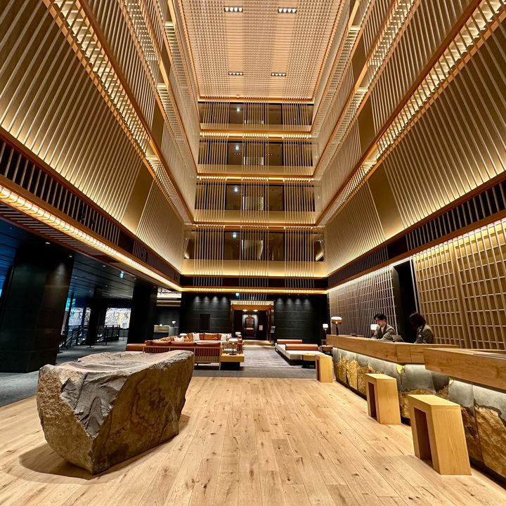 エントランスを入った瞬間、息を飲むほど美しい格子状の吹き抜けのロビーが出現。京都の伝統工芸の織物をイメージしたデザインが5階まで張り巡らされた、圧巻の眺めです。フロントの前には伊達冠石(だてかんむりいし)という、宮城県でしか採れない貴重な石が鎮座し、こちらも力強い存在感を放っています。