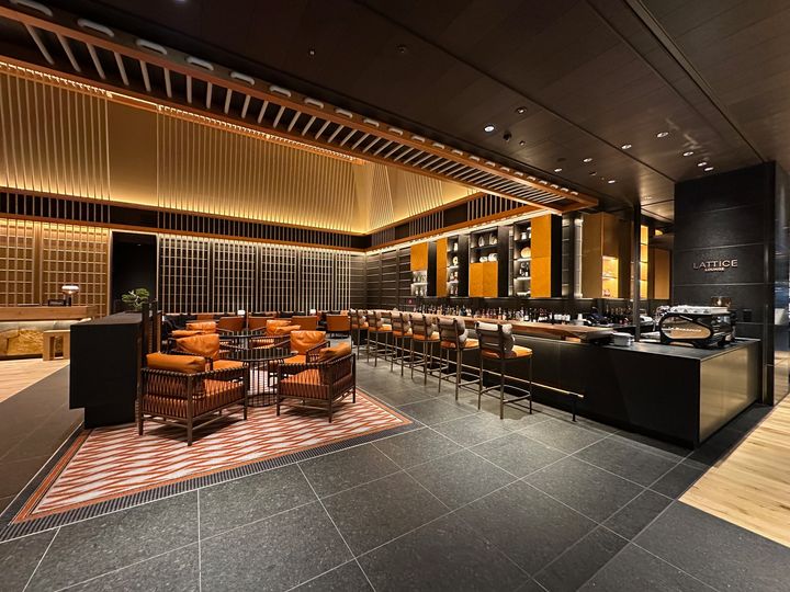 ロビーの一角にある「LATTICE LOUNGE(ラティスラウンジ)」。軽食やカフェメニュー、オリジナルのアフタヌーンティーなどがメニューにラインナップ。バーとしても利用できます。
