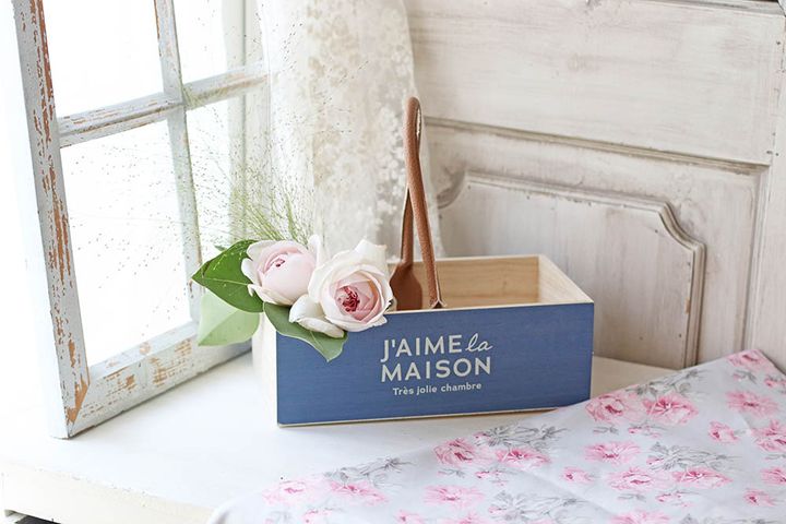 ブルーのペイントに文字が描かれた、おしゃれな木製ボックスでした。これは花と相性がよさそう! 大小あったので小さめのほうを購入しました。