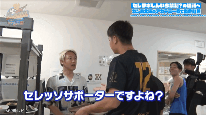さらに、しんいちが案内してもらったのは、寮の食堂。するとそこへ、うわさの荒木琉偉選手が登場! 身長194センチの荒木選手に、しんいちが思わず「でっかー」と驚くと、荒木選手はしんいちを見下ろして、「あれ? セレッソサポーターですよね? なんでこんなとこにいるんですか?」と先制攻撃!