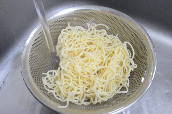 電子レンジを使う場合は、プラスチック製の耐熱容器(容量1L以上)に麺を入れ、水400ml(分量外)を加えて、ラップをせずに電子レンジ600Wで7分30秒加熱し、たっぷりの冷水で冷やして水気を切ればOK!