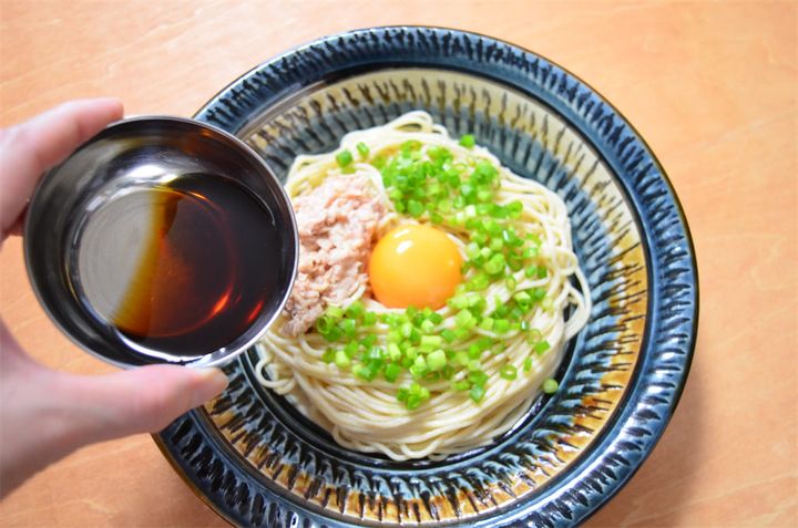 2器に大豆麺を盛り、ツナ缶の汁気を切ってのせる。中央に卵黄をのせ、小口切りにした青ねぎを添える。本つゆ、ゴマ油を回しかけ、粗びき黒こしょうを振る。