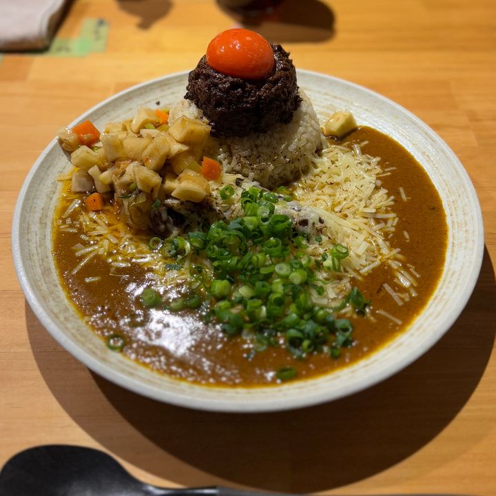 カレーは辛さとサイズ・トッピングを選ぶことができ、ご飯の上にはキーマカレーと卵黄が乗っています。憧れのビジュアルとついに対面できて嬉しい〜〜!!!