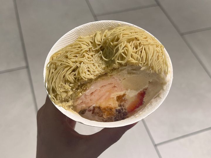中にはカットしたイチゴ、イチゴのジュレ、メレンゲ、イチゴと和栗のアイス、その上にモンブランクリームがのっています。