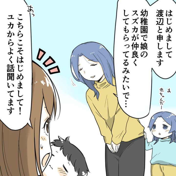 すると、「はじめまして。渡辺と申します。幼稚園で娘のスズカが仲良くしてもらってるみたいで・・」丁寧な挨拶をされ、「あっ、こちらこそはじめまして!ユカからよく話聞いてます」と挨拶しました。