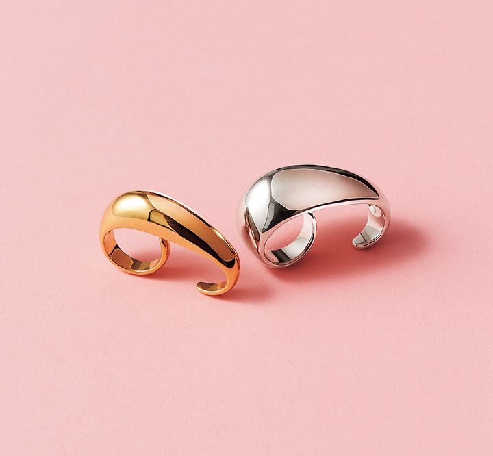 2本の指に通すダブルフィンガーリングです。〈右から〉リング〈SV〉リング〈SV+18K〉(ともにASAMIFUJIKAWA/ショールーム セッション)