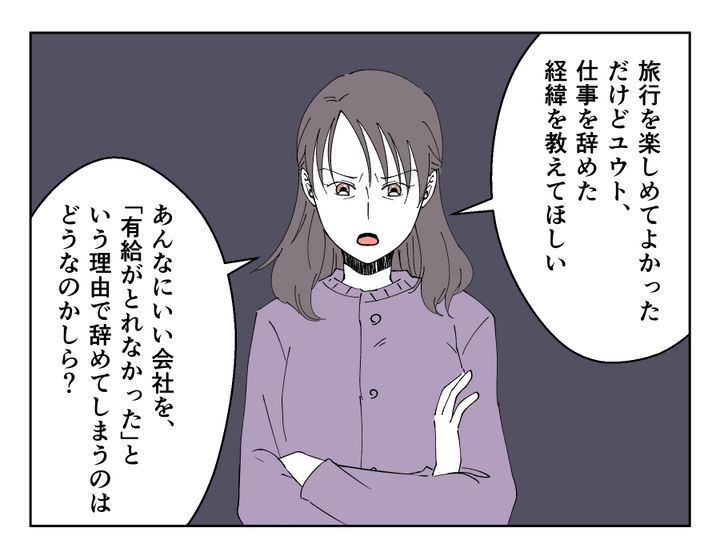 ユキコさん(55)はとある地方で旦那さんと2人暮らしをする専業主婦。息子のユウトさん(23)を社会人になるまで育てあげ、平穏な日々をおくっていました。しかしそんなある日、突然ユウトさんから電話で「会社を辞めた」と告げられてしまいました。 超ホワイト企業をあっさり辞めてしまったユウトさんに対し、理解に苦しむユキコさん。海外旅行から帰ってきたユウトさんに、直接話を聞くことになって……!?