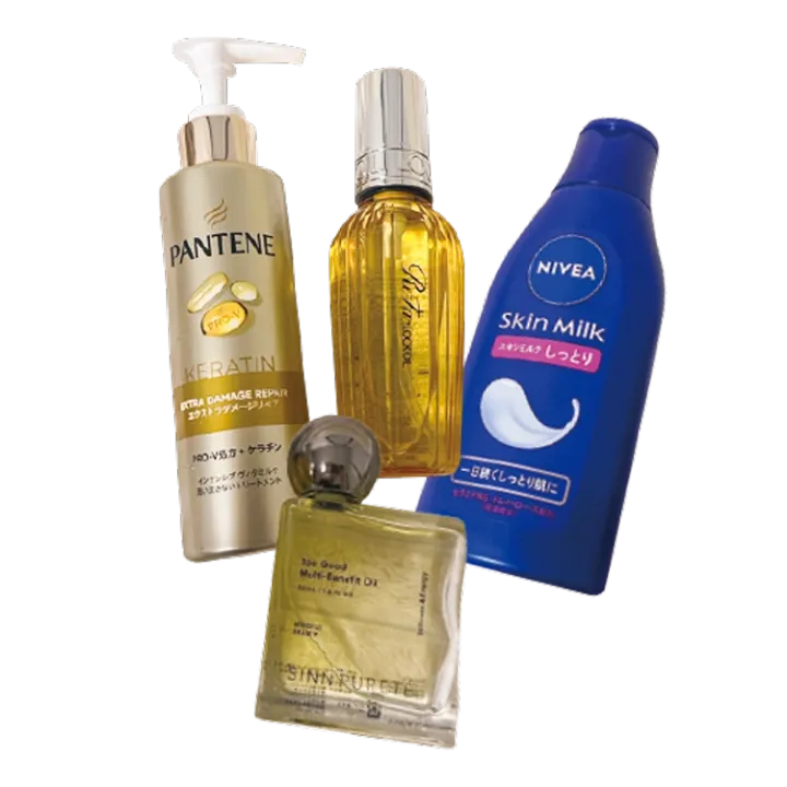 お風呂上がりは全身保湿が欠かせません。美白のためのボディミルク、毎日のパックと、ヘアオイルは日によって2種類を使い分け。