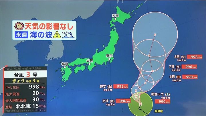 きょう3日(木)午前3時に南海上で台風3号が発生しました。来週火曜日にかけて日本の東海上を北上します。道内への天気の影響は小さいですが、来週は海の波の情報に注意して下さい。