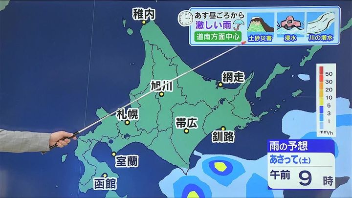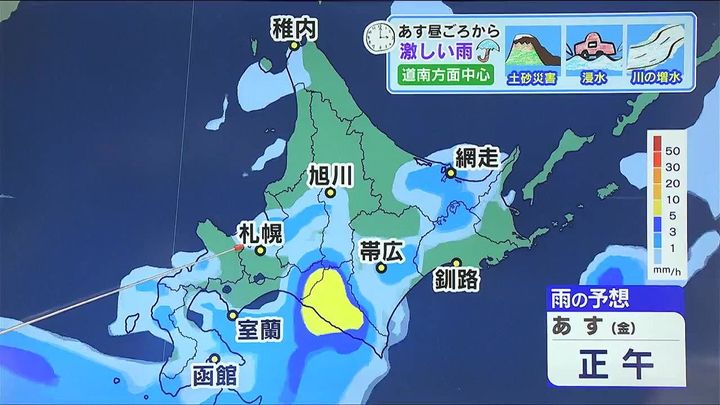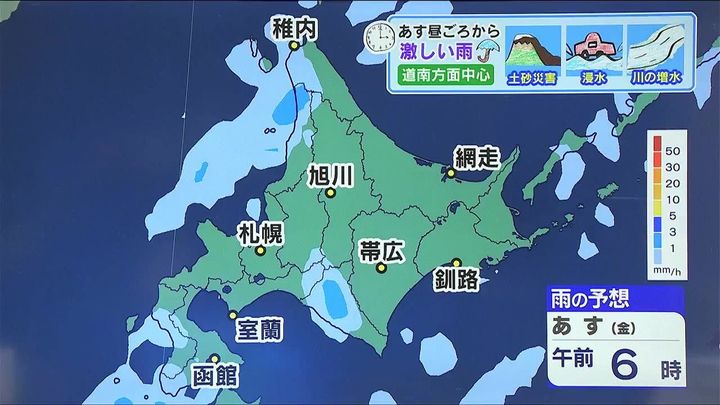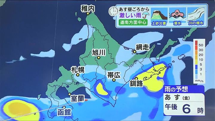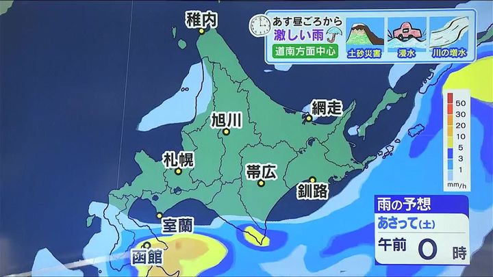 土曜の朝には広く雨はやむ見込みです。あす4日(金)午後は道南方面を中心に大雨による土砂災害、低い土地の浸水、河川の増水に注意して下さい。そして、あすは大気の状態が非常に不安定になります。