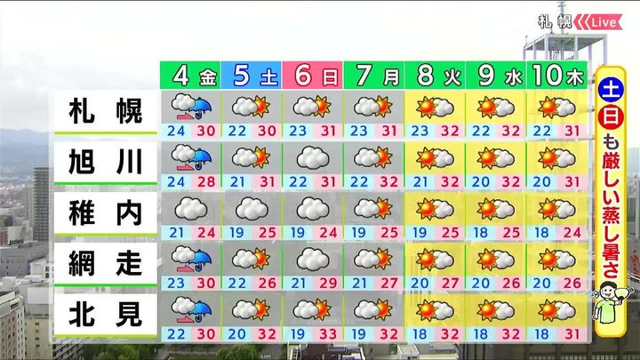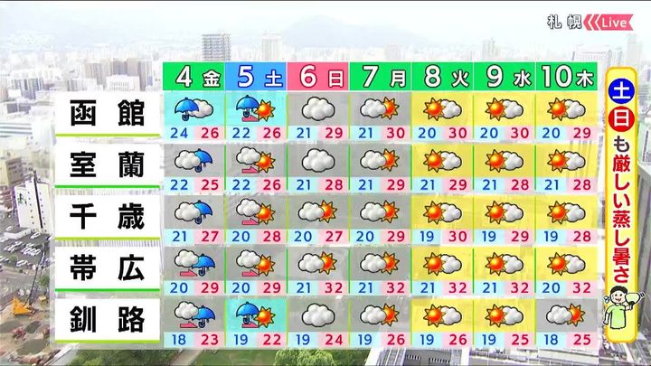 土曜日は日差しが戻ってきます。土日はお出かけにまずまずの天気ですが、札幌や旭川、北見は連日30度以上で週末にかけて厳しい蒸し暑さが続きます。