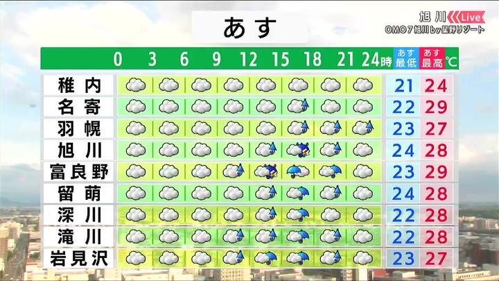 朝は海岸部で小雨の降る可能性があります。午後は上川地方を中心に雷雨となるでしょう。雨具を忘れないで下さい。蒸し暑さと寝苦しさが続きます。