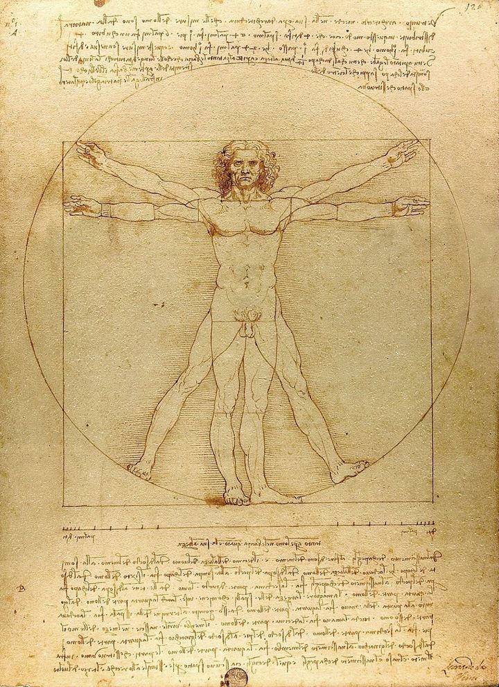円と正方形の中に、手足を広げた裸の男性がぴたりと収まるあの有名すぎる絵、「ウィトルウィウス的人体図」です。