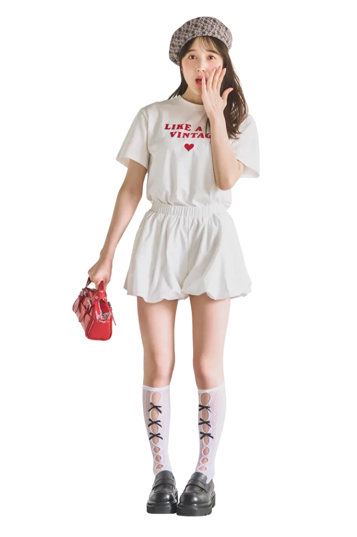 バルーンミニパンツで丸いシルエットを出して存在感ましまし♡ ローファーとベレー帽で女のコらしいレトロコーデに。