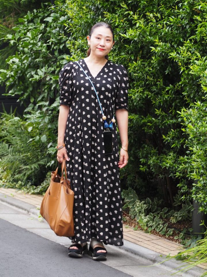 小さな白い花模様が全体に散りばめられたフェミニンなワンピースは、「ヌキテパ」のもの。落ち着きのある色味ながら、インド綿の軽やかな質感が夏の装いにマッチ!