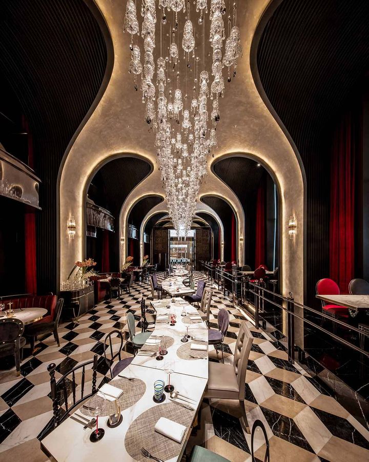 アーチ風の設えや豪華なシャンデリアなどは欧州の重厚な劇場などを連想させ、ダイニングに一歩足を踏み入れた瞬間から、ラグジュアリーな空間に魅了される。