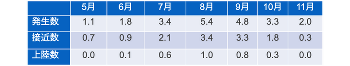 以下の表では、2000年~2024年の5月~11月における台風の発生数・接近数・上陸数を年平均で示しました。