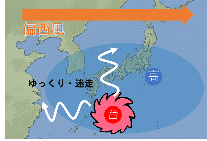 夏の台風が迷走しやすい理由は、日本付近が夏の高気圧に覆われ、台風を流す偏西風が北上しているためです。