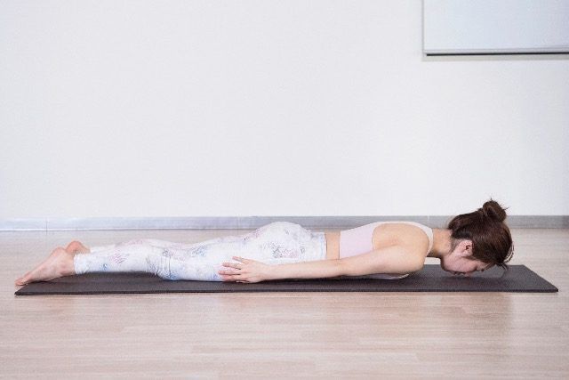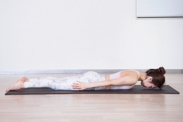 (1)床にうつ伏せになって両脚を腰幅に開き、お腹を凹ませて両腕を体側に置く