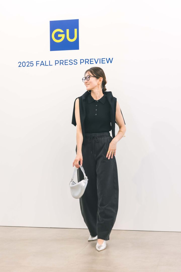 デニムスウェットバレルレッグパンツ¥2,990 2ピースリブニットポロシャツ(ノースリーブ)¥3,990(ともに8月中旬発売予定)(ともにジーユー)※すべてMサイズ着用 靴、バッグ、メガネ(すべて私物)
