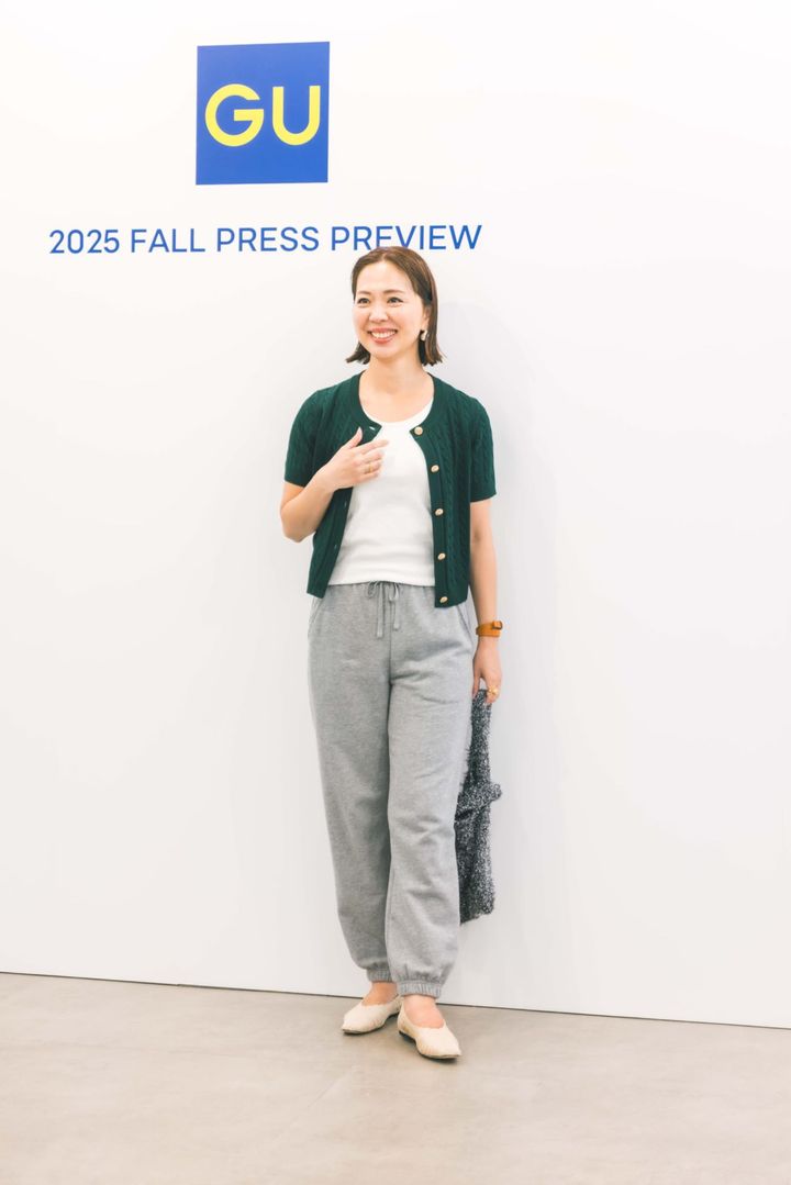 「夏から秋へ季節スイッチするなら、カラーニットのカーディガンを組み合わせて。あると便利なグレーのスウェットは、シルエットが上品でラフになり過ぎないように、レディに穿くのが気分。デイリー使いだけではなく、オフィスでも使えるシックなグリーンのニットカーディガンで地味感を回避しながら家族でBBQやグランピングを楽しみたい。」