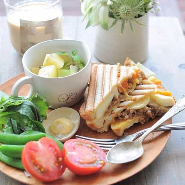 朝からがっつりいきたい方には、おかずをモリモリに挟んだホットサンドがおすすめ。スパイシーな朝ごはんは体が元気になりますね!