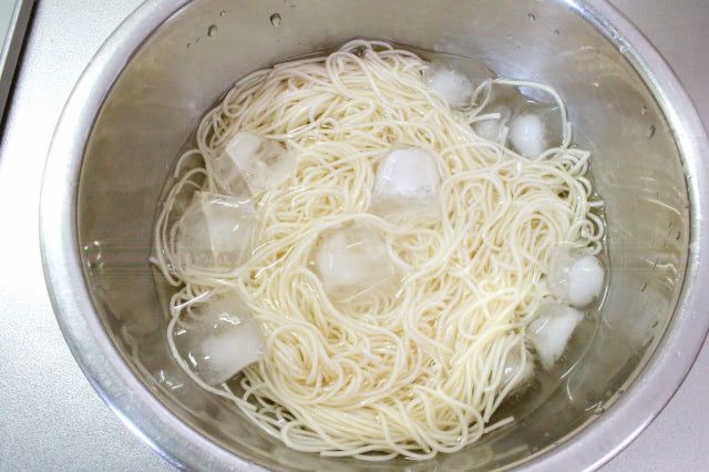 今回はそうめんを1分50秒茹でて流水でぬめりを取り、氷水に2分ほど浸けました。キンキンに冷えたらザルに上げて、しっかりと水気を切っておきました。