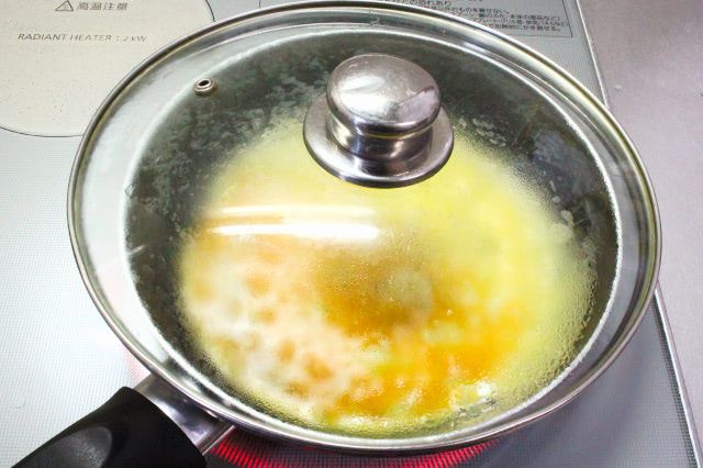 2. フライパンに油を引き、弱火で熱します。塩(少々)を加えた卵液を注いでフタをし、1分ほど焼いて薄焼き卵を作ります。