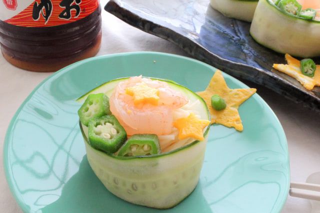 きゅうりは水分があるので、輪にすると自然にピタッとくっついて留まりますよ。直径6cmくらいの輪っかにして、中に2口分くらいのそうめんを詰め、エビ、オクラ、星の薄焼き卵を乗せます。