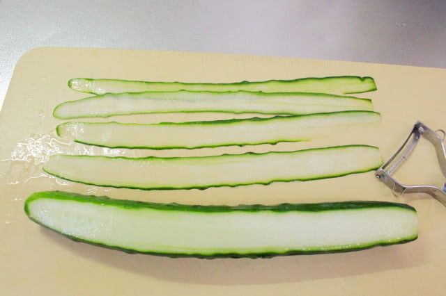 4. きゅうりの両端を少し切り落とし、ピーラーで細長くスライスします。