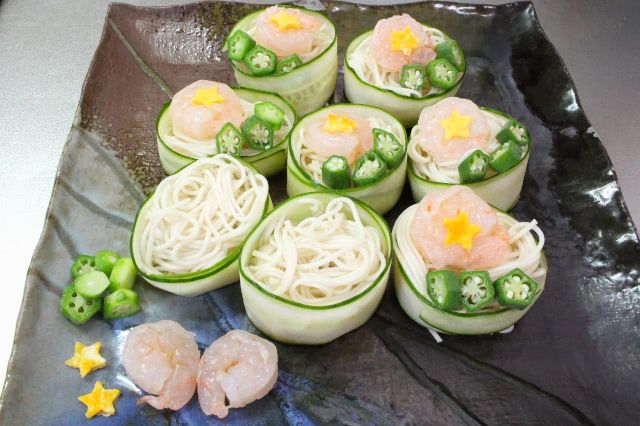 「七夕そうめん」の盛り付けに欠かせないのが、縦に薄くスライスした、きゅうり。これを輪っか状にし、中にそうめんを詰めるんですって。