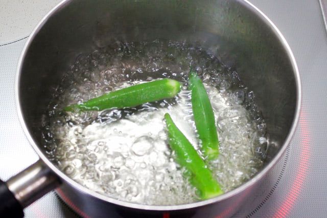 塩で板ずりにしてオクラの産毛を取り除き、2分ほど茹でてから、流水で粗熱を取りました。急冷するとオクラの鮮やかな緑色を保てますよ。