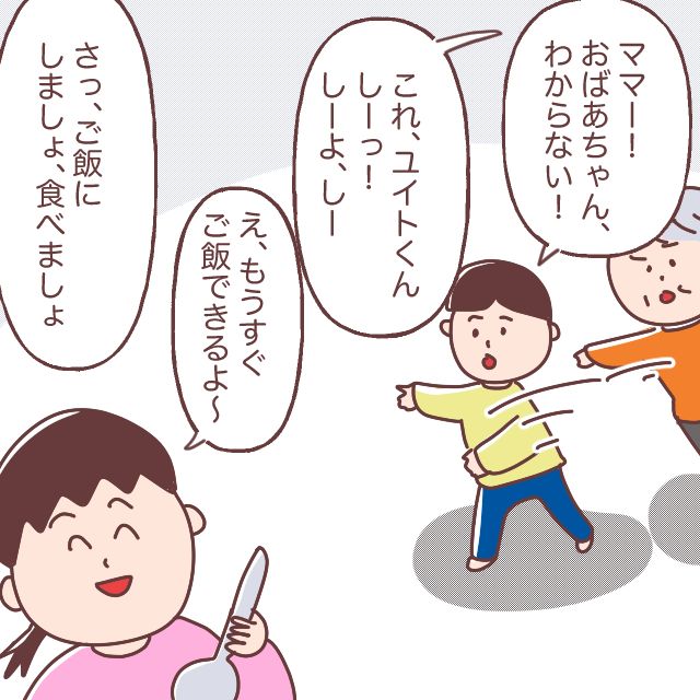 すると、「ママー!おばあちゃん、わからない!」そう言いながら駆け寄って来るユイトに、「これ、ユイトくん、しーっ!しーよ、しー」とバレないよう念押しする義母。思わず笑いながら「え、もうすぐご飯できるよ~」と声をかけると、「さっ、ご飯にしましょ、食べましょ」と義母が話をすり替えました。