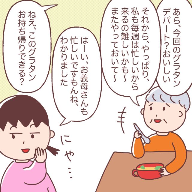 そして、「あら、今回のグラタン、デパート?おいしい。それから、やっぱり私も毎週は忙しいから来るのは難しいかも~。またやっておいて~」サラリと逃げる義母は、「ねえ、このグラタンお持ち帰りできる?」と持ち帰ることも忘れません。そう言われて、「はーい、お義母さんも忙しいですもんね、わかりました」にやりとしながら答えるのでした。
