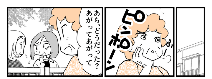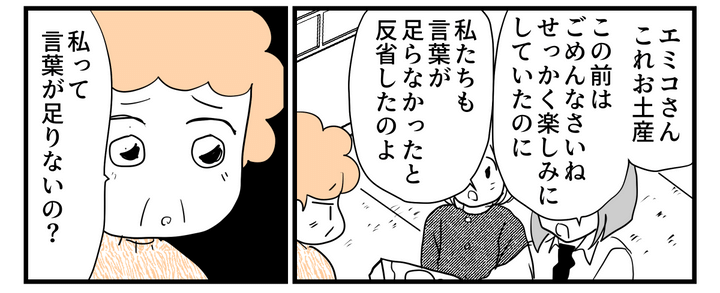 シズカさんとチアキさんが旅行のお土産を渡しに、うちをたずねてきてくれました。正直、旅行当日のことは頭にきていました。そして、悲しかったです。けれど……ユカちゃんにも2人にも同じことを言われたのが気になっていたのも事実。私は思い切って「私ってそんなに言葉が足りないの?」と、2人に聞いてみたのです。