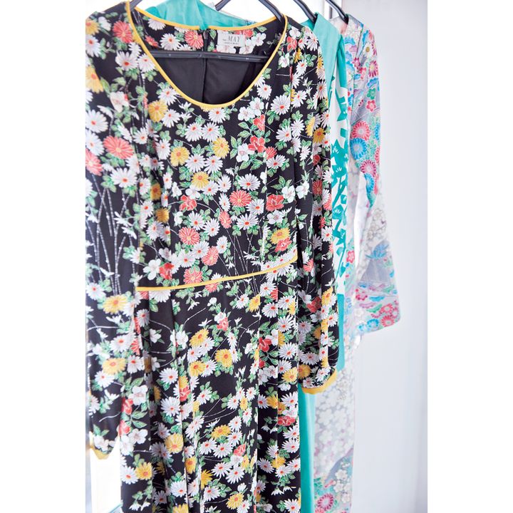 数年前から和ダンスに眠っていた着物のリサイクルに着手。スカーフや小物入れはもちろん、ワンピースに作り替えると見飽きた柄が蘇り、とても新鮮な一着になるのが楽しくて。