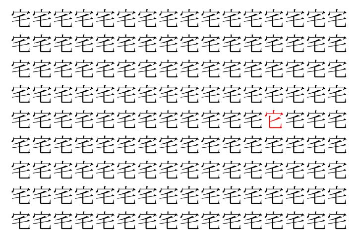 画像の中には、「宅」という漢字が縦に9行、横に16個並んでいます。 全部で144個となりますが・・・、そのうち1つは「異なる漢字」となってますよ!!
