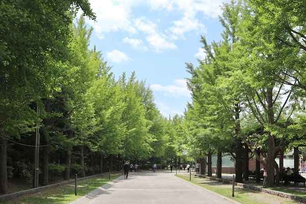 夏の間は濃いグリーン色に輝くイチョウ並木!青空を背景に、見事な景色に釘付けです。
