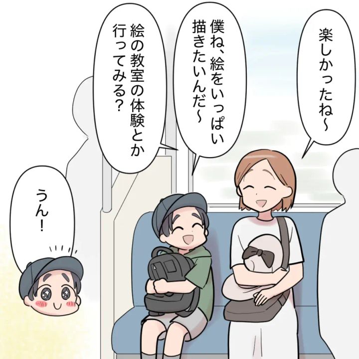 帰りの電車で「楽しかったね~」と話しかけると、「僕ね、絵をいっぱい描きたいんだ~」と教えてくれたアオイ。「絵の教室の体験とか行ってみる?」と提案してみると、アオイは「うん!」と目を輝かせました。