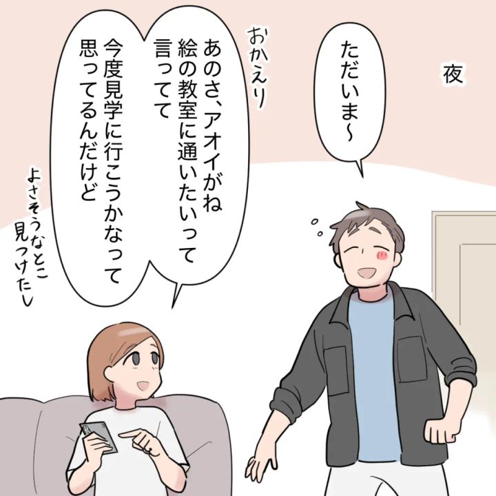 その夜。友達との集まりから上機嫌で帰ってきた夫にさっそく「あのさ、アオイがね、絵の教室に通いたいって言ってて。今度見学に行こうかなって思ってるんだけど。よさそうなとこ見つけたし」と話しました。