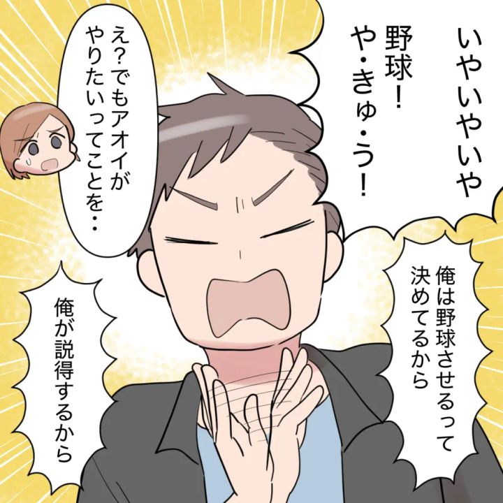 すると、夫は「いやいやいや。野球!や・きゅ・う!俺は野球させるって決めてるから」と熱く主張。私が「え?でもアオイがやりたいってことを・・」と私が言っても「俺が説得するから」と聞く耳を持ちません。