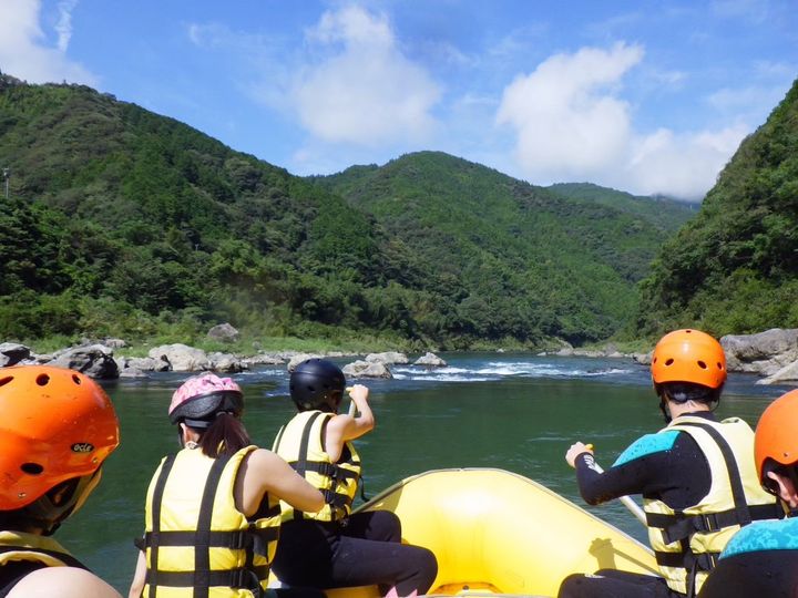 さあ、まずは仁淀川へ向かいましょう!夏らしさ全開のアクティビティ、ラフティング。ゴムボートに乗り、パドルを使って川下りを楽しむ、スリル満点の冒険です。