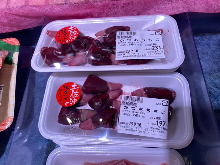 さっそくカツオの「ちちこ」という部位を見つけ、「これ、なに!?」と思わず写真を撮ってしまいました。高知といえばカツオですが、こんな珍しい部位まで売られているなんて。もちろん購入し、その日の夕飯の一品として調理してみました。