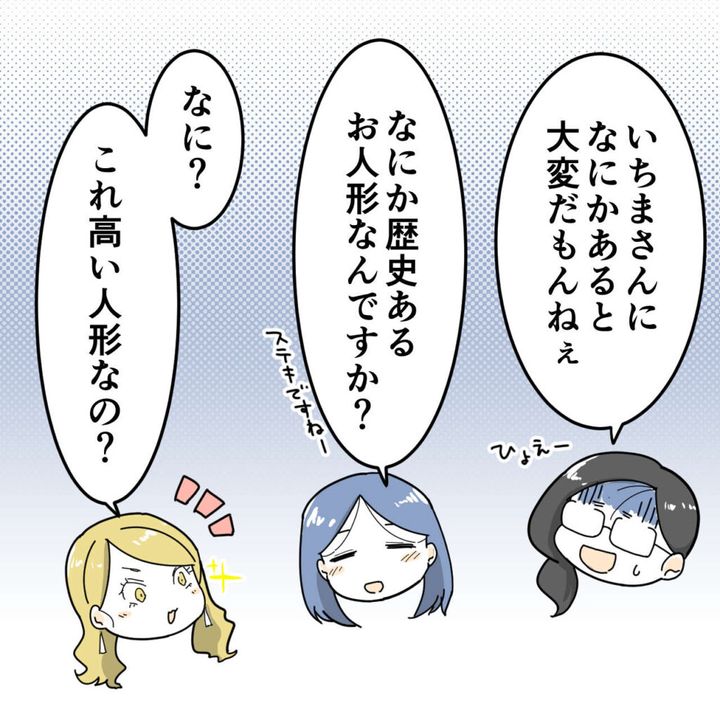すると、「いちまさんになにかあると大変もんねぇ」とミチコが言い、「なにか歴史あるお人形なんですか?」スズカちゃんの言葉を聞いていた山本さんが「なに?これ高い人形なの?」そう言って目を輝かせて言いました。