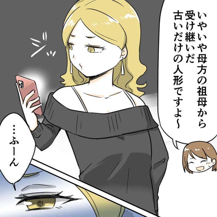 「いやいや母方の祖母から受け継いだ古いだけの人形ですよ~」私がそう答えると、「・・ふーん」と何やら怪しげな目をする山本さん。