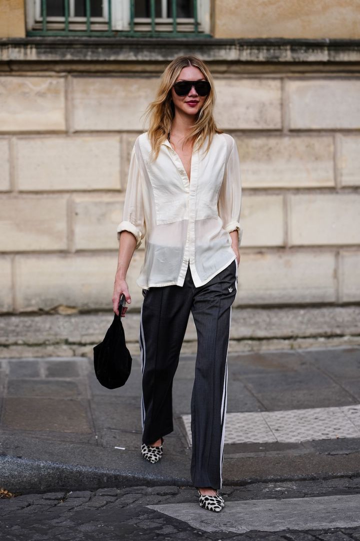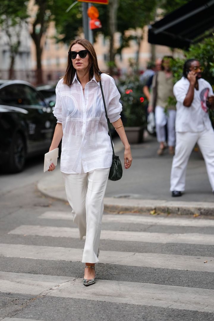 さっと羽織るだけでニュアンスが出るシアーシャツは、この夏のマストアイテム。気になる二の腕や腰まわりを自然にカバーしつつ、透け感が軽やかで涼しげな雰囲気を演出してくれる。上のスナップの女性は、アディダスADIDAS)のスラックスにとろみのあるシャツを合わせ、透け感を活かしてスポーティなボトムを上品に昇華。一方、オールホワイトの女性は、異なるテクスチャーのボトムとコーディネートし、計算された大人の涼感スタイルを披露。