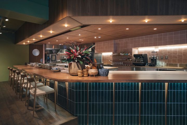 太陽に照らされた森林を思わせる柔らかなグリーンの壁が印象的な店内には、温かみのある木製家具や観葉植物を配置。エントランスの階段部分にはヤシの木を編んだラグを敷き、ラタンをイメージした天井やカラフルな座面の椅子などが空間を彩る。南国のヴィラで過ごすような癒し、そしてくつろぎの時間を楽しめるのも魅力だ。